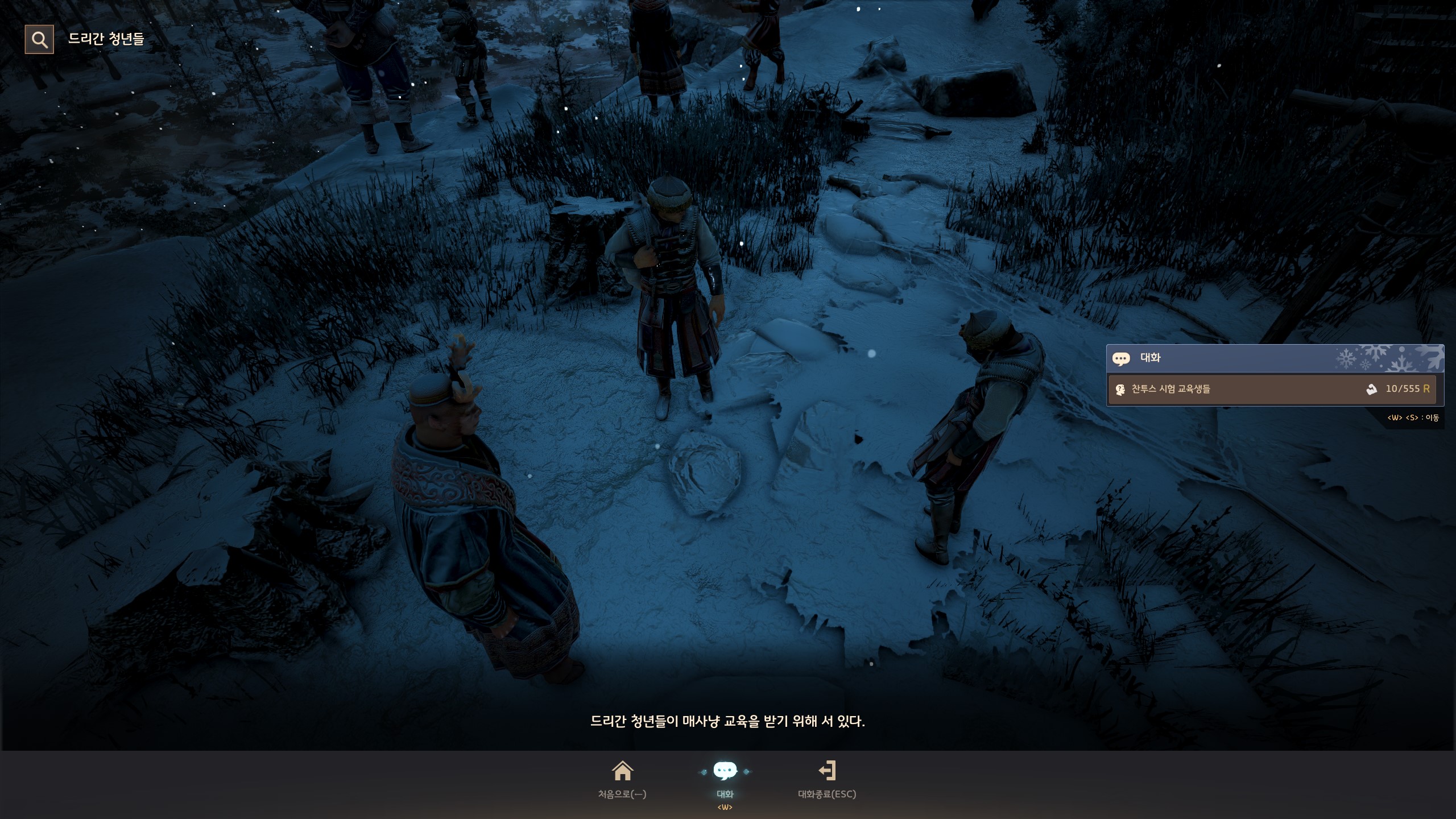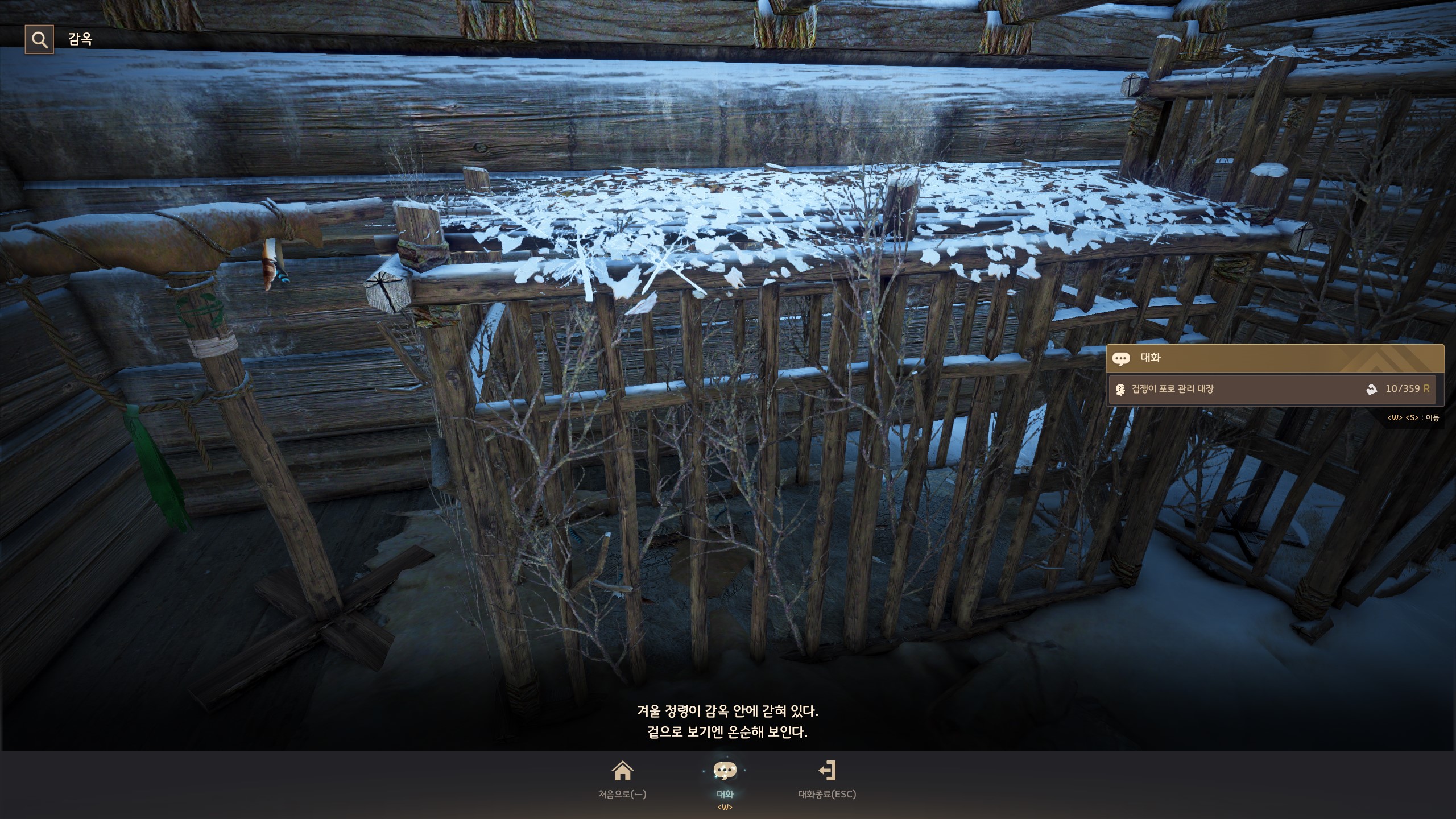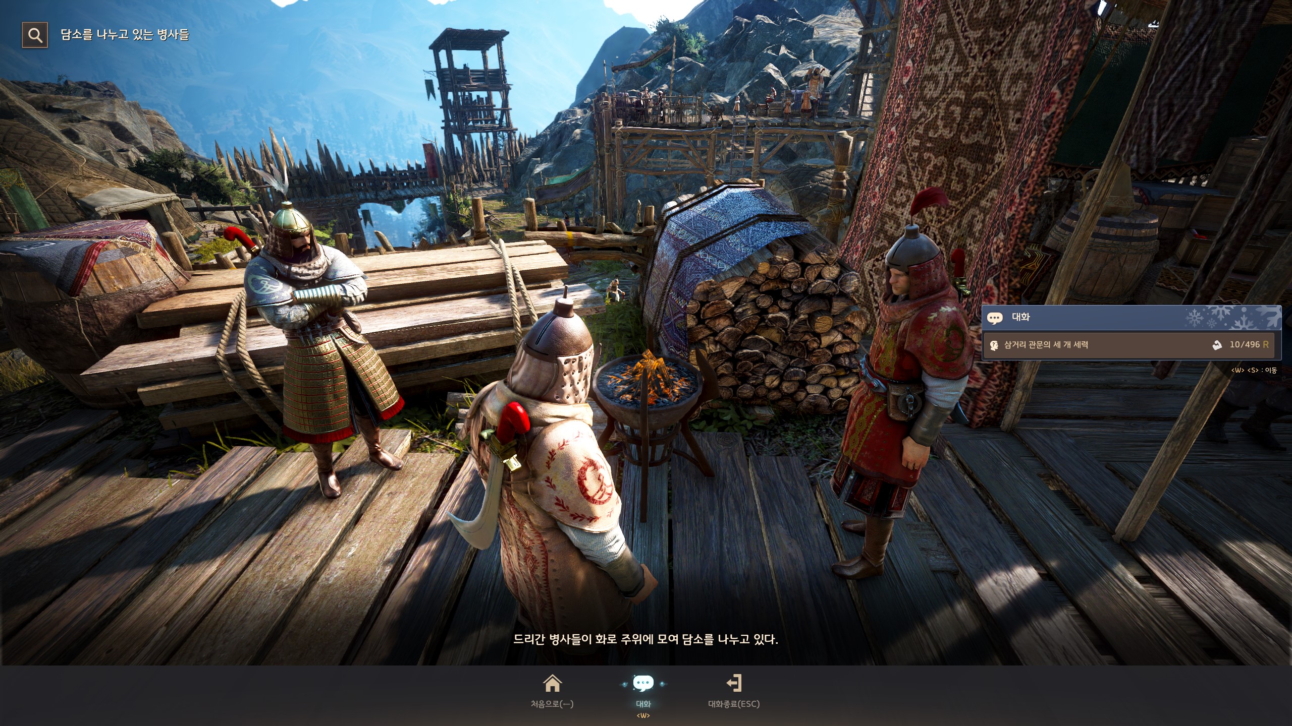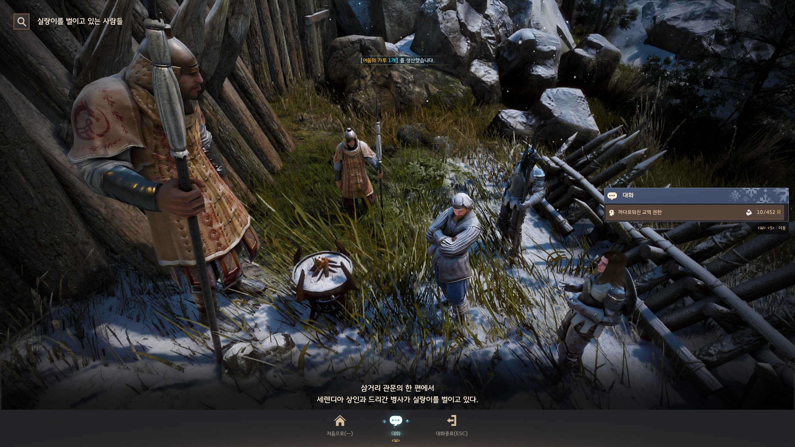 → 눈보라 초소 <경비 대장> 아이젠을 마주 보고 오른쪽의 오르막길을 따라 올라가면 <검은망령 포로관리> 테무진 뒤에서 지식을 획득할 수 있어요. 지식 획득 시 기운 10이 소모돼요.