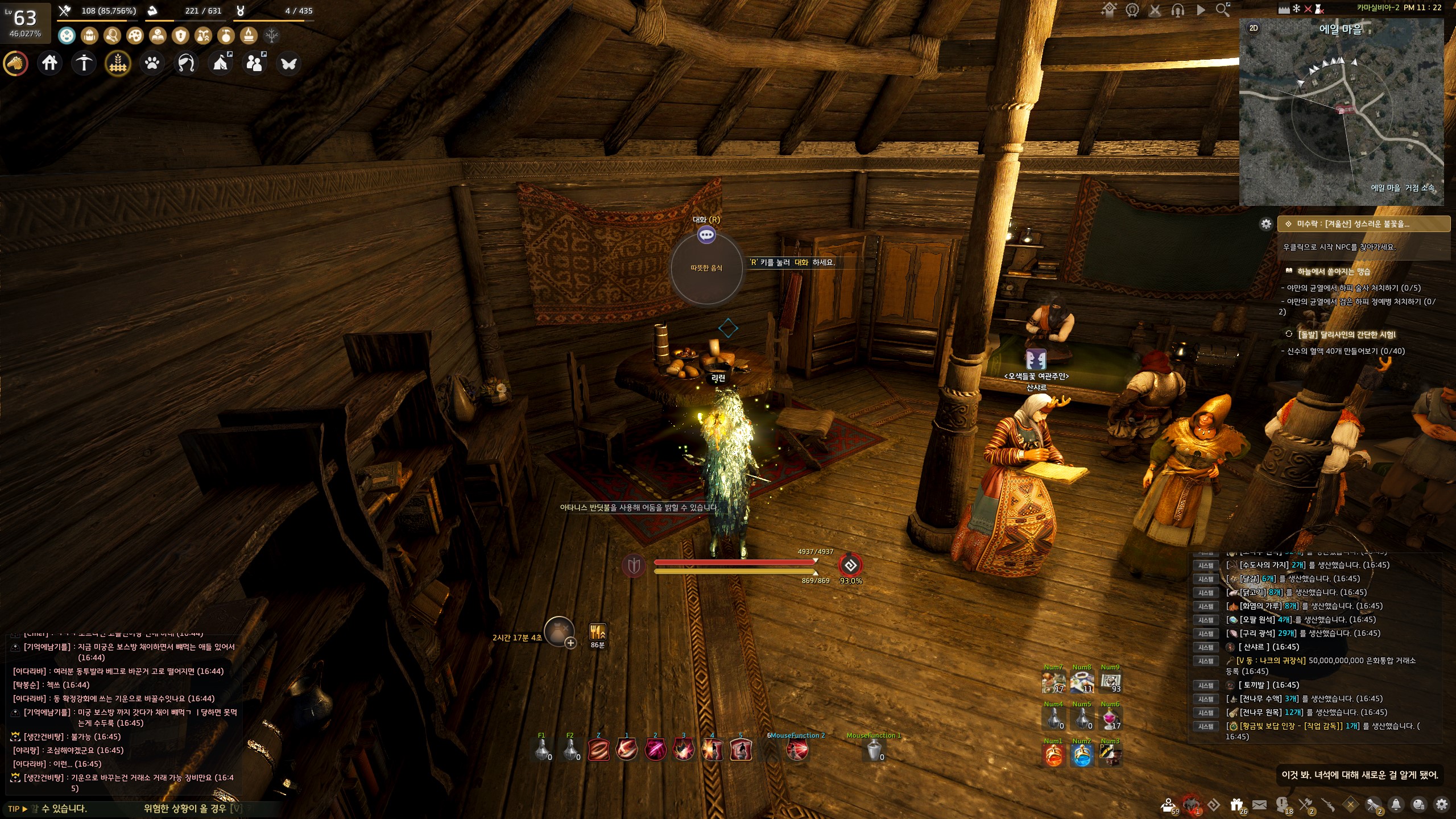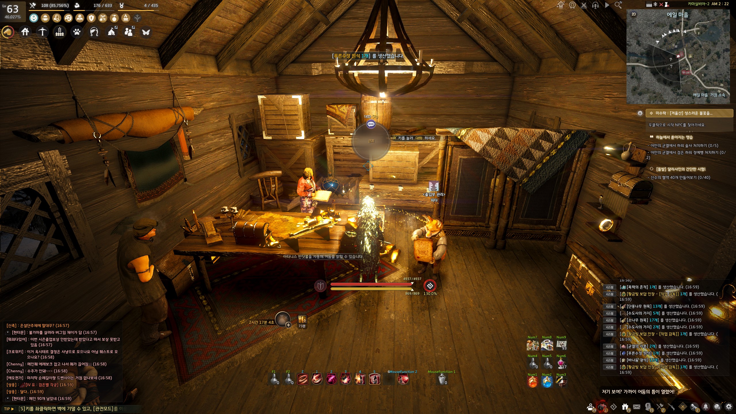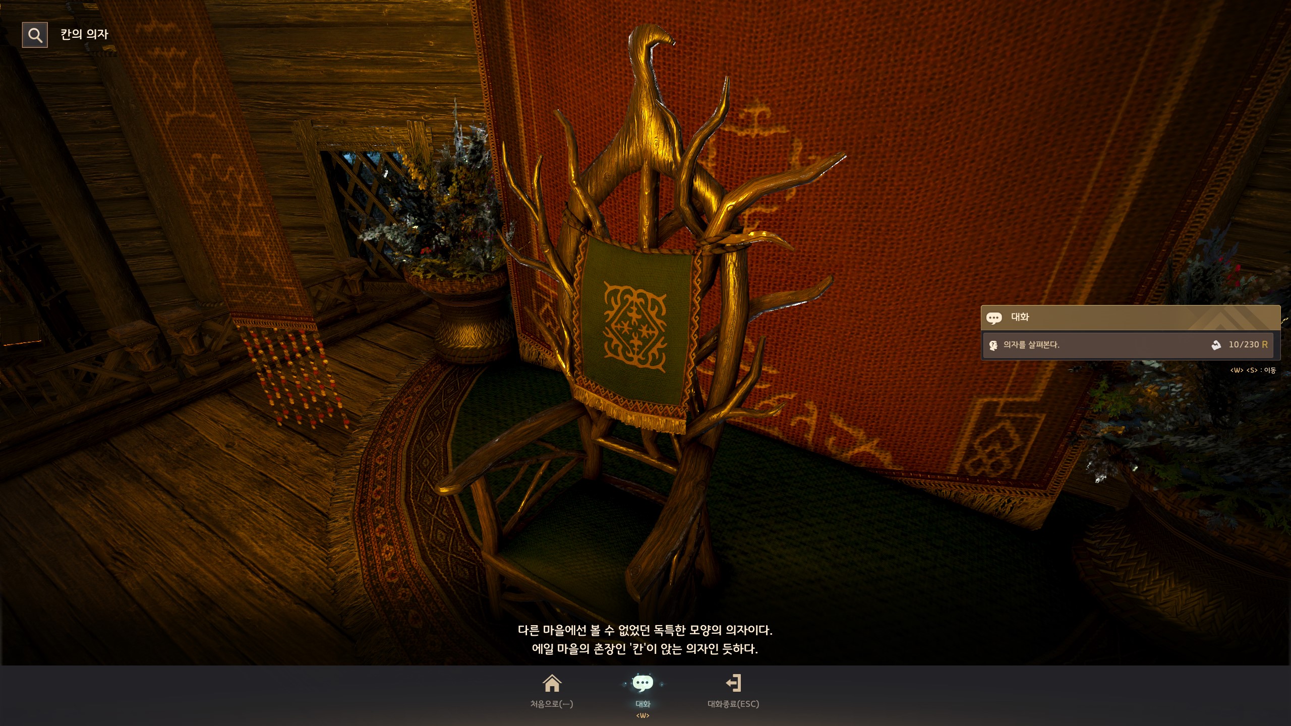 → 에일 마을 <에일 마을 촌장> 훈비쉬가 있는 건물 안 의자에서 지식을 획득할 수 있어요. 지식 획득 시 기운 10이 소모돼요.