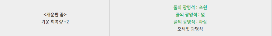 아직 광명석 세팅은 안해둬서 유물 칸은 비어있는데 모든 채집물 획득 확률 증가 조합식을 쓰기 전까지는 '개운한 꿈' 조합식이 체감이 좋다고 해요.