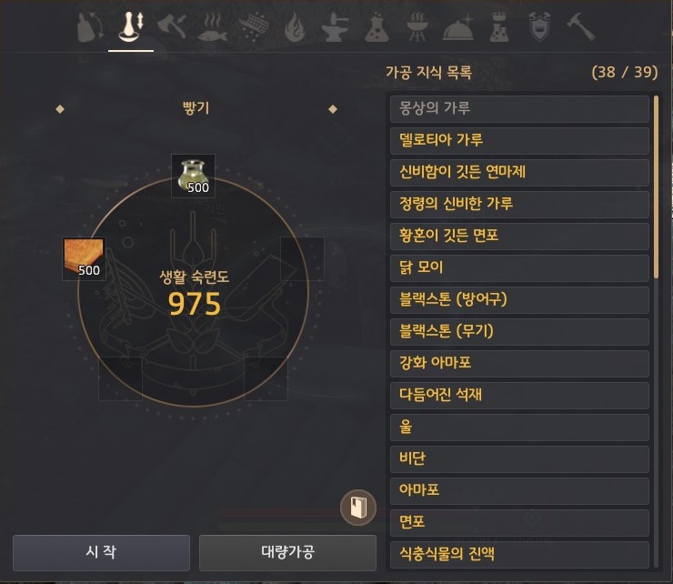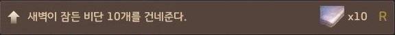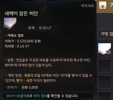 → 새벽이 잠든 비단은 거래소에서 사서 건네줘도 되고 매물이 없다면 폭풍의 오일 500개, 비단 500개로 가공(L) - 빻기로 제작해야 해요.