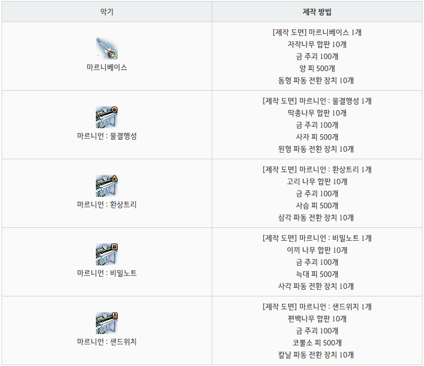 | 마르니스 악기 | - 마르니의 상점에서 제작 재료를 구매하여 제작 또는 일일 의뢰를 통해 제작 후 등록 |