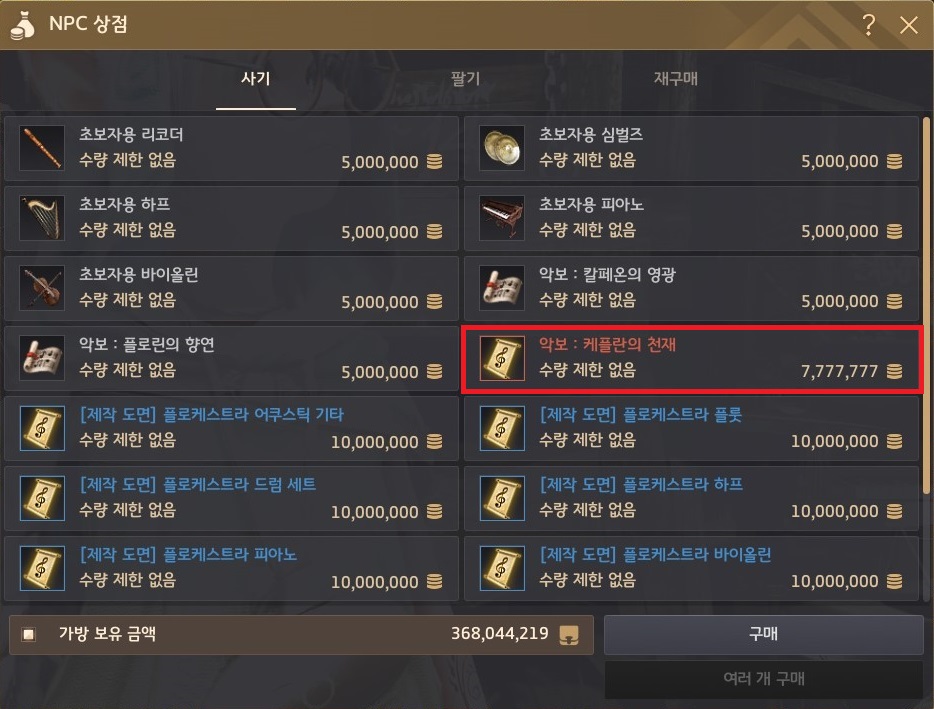 | 초보자용 악기 | - 아르니티의 상점에서 각 500만 은화에 구매하여 등록 |