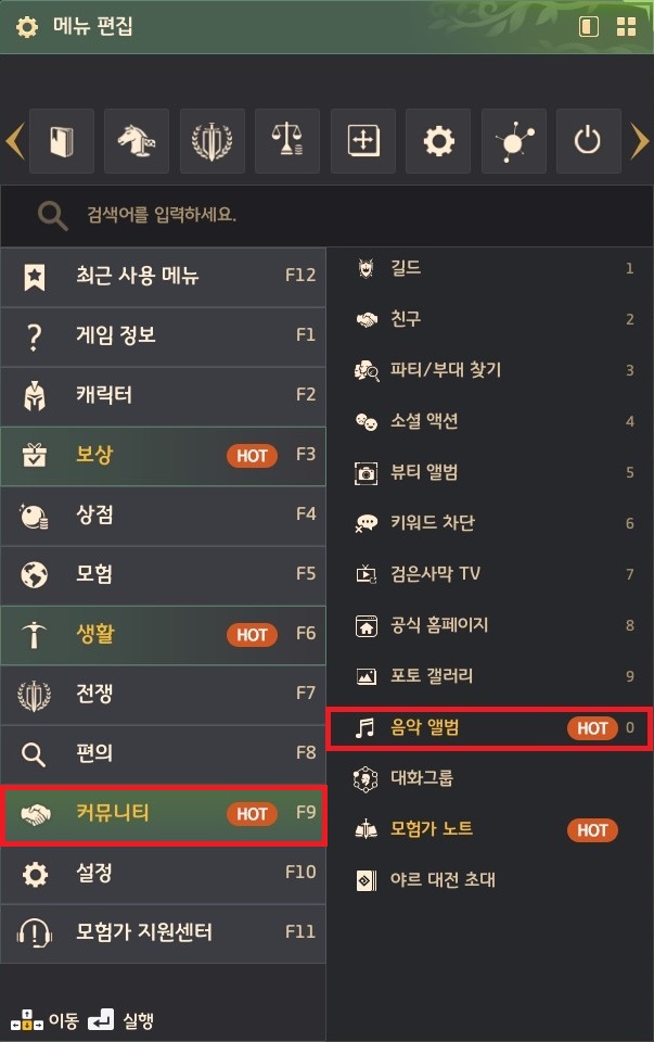 - ESC메뉴 - 커뮤니티(F9) - 음악 앨범