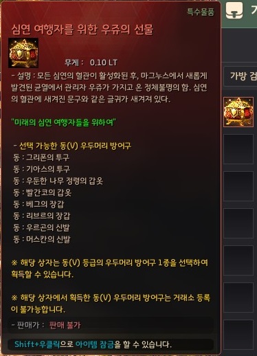 동(V) 우두머리 방어구를 선택하여 받을 수 있는 심연 여행자를 위한 우쥬의 선물 상자예요. 필요한 부위로 받으시면 됩니다.