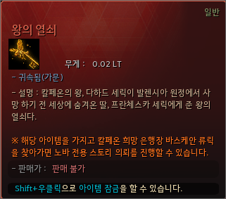 56레벨 이상, [노바 전승] 피의 계약 의뢰까지 완료한 노바 클래스로 왕의 열쇠를 소지한 채 칼페온 창고지기 바스케안 류릭을 찾아가면 왕의 열쇠에 관한 스토리 의뢰를 진행할 수 있습니다.
