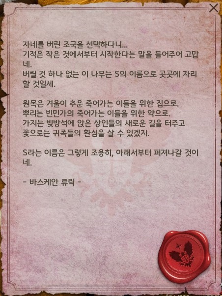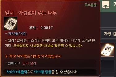 의뢰를 전부 완료하면 하우징 '가구인 나의 어린 천사'와 의문의 밀서를 개봉하면 '밀서 : 아낌없이 주는 나무'를 획득할 수 있어요. 의문의 밀서는 분기 선택에 따라 내용이 약간씩 달라질 것으로 보이네요.
