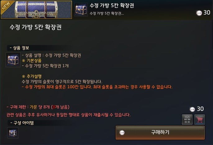 그리고 수정 프리셋은 최대 10칸, 수정 가방은 최대 100칸으로 증가되었고, 의뢰와 마일리지 상점 이외에도 펄 상점에서 추가로 구매하실수 있습니다.