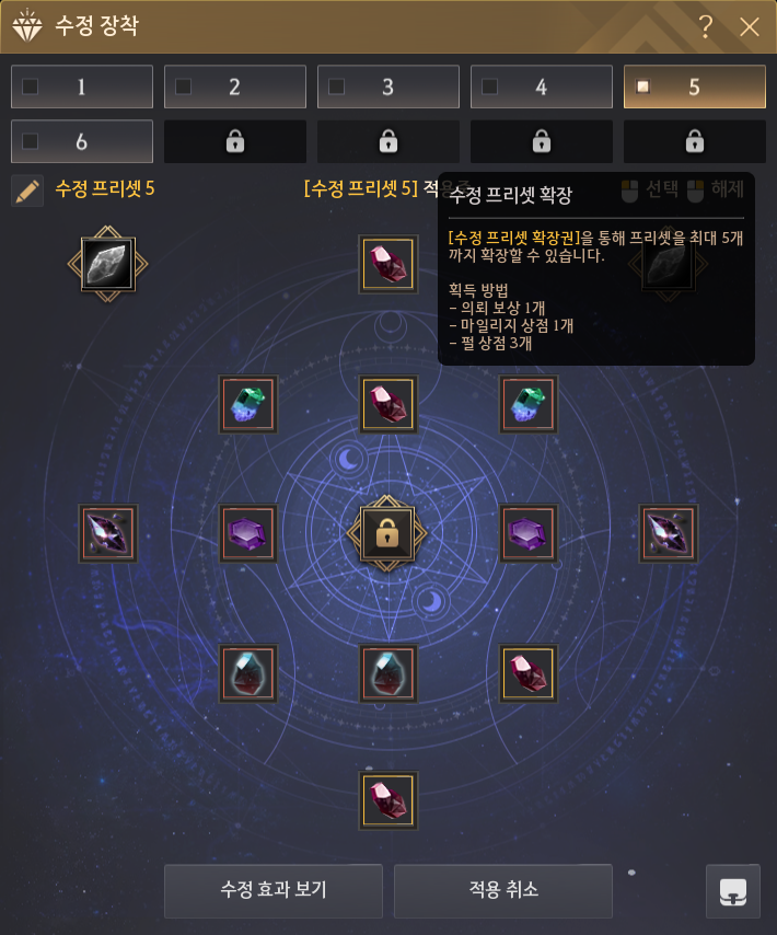 2022.12.28 수정 프리셋이 업데이트되었습니다. 수정 프리셋이 업데이트되기 전에는 부위별로 장착 가능한 수정이 정해져 있어서 수정착용의 제약이 컸는데요.