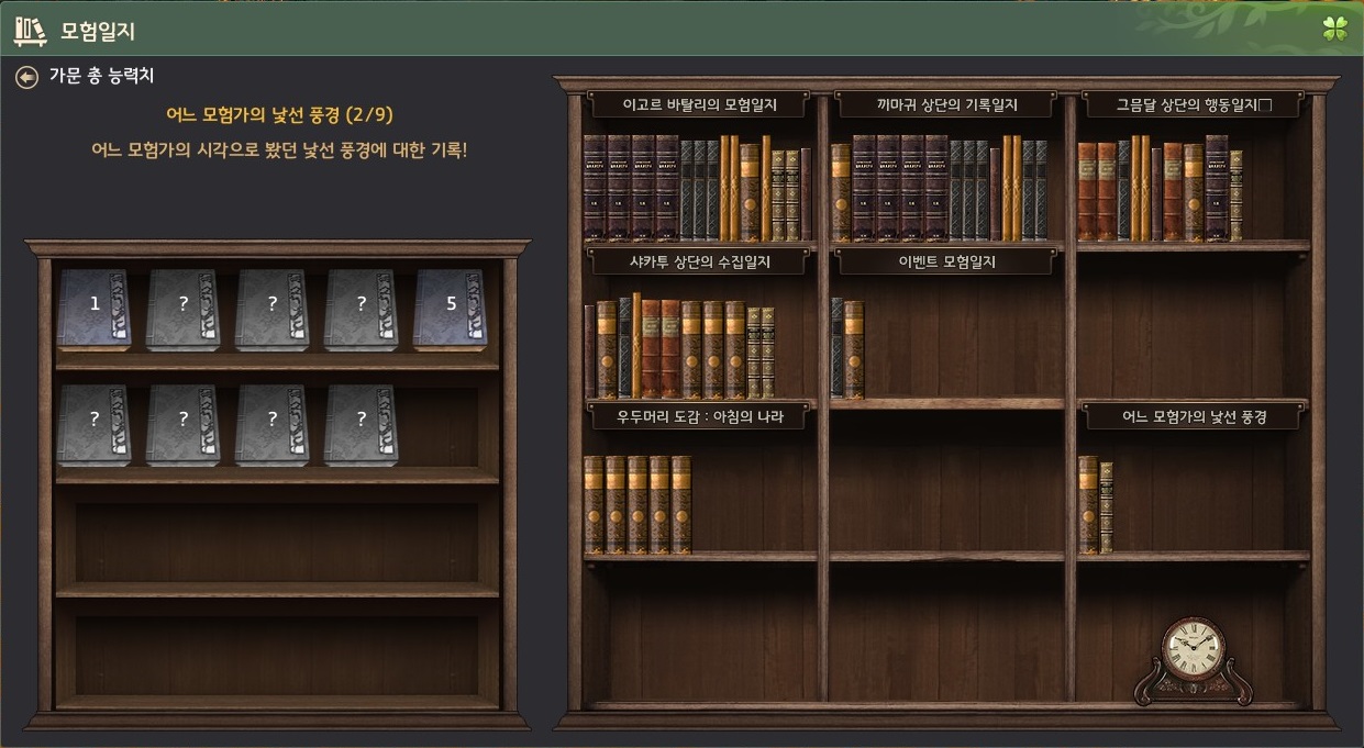 어느 모험가의 낯선 풍경 5권을 완료해야 6권 ~ 9권을 순서대로 진행할 수 있어요. 1권씩 전부 완료해야 다음 모험일지를 진행할 수 있으니 무조건 순서대로 일지를 완료하셔야 합니다. 같은 권 안에서는 순서가 상관이 없습니다.