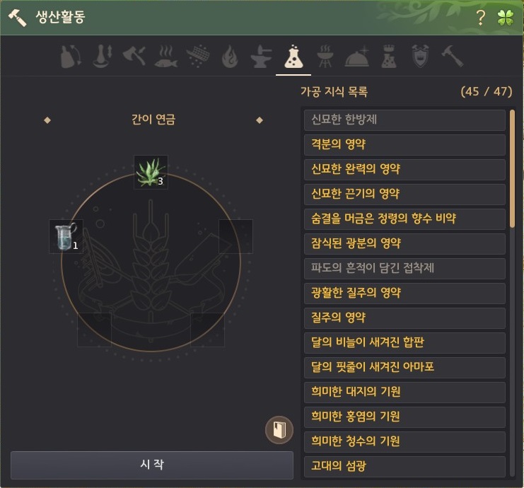 - 약초수 만들기 ([가공창]에서 여명초 3개와 요리용 생수 1개를 [간이 연금]하여 얻을 수 있습니다.)
