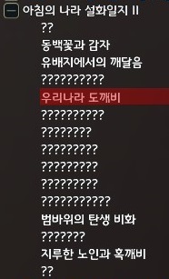 8개의 연속의뢰로 구성되어 있으며, 의뢰를 전부 완료하면 지식(H) - 모험일지 - 아침의 나라 일지 - 아침의 나라 설화일지 II 중 '우리나라 도깨비' 지식 1개를 획득할 수 있습니다.