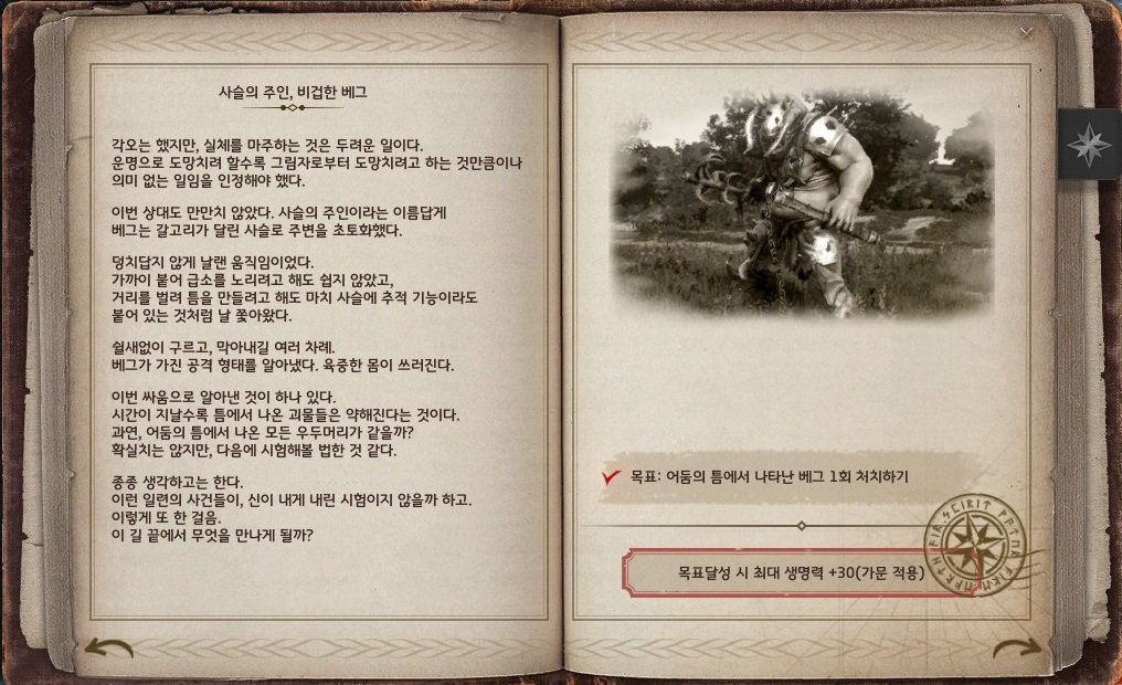 1권을 전부 완료하면 총 최대 생명력 +200이 증가하고, 가성비가 좋은 편이니 완료하는 걸 추천해요.