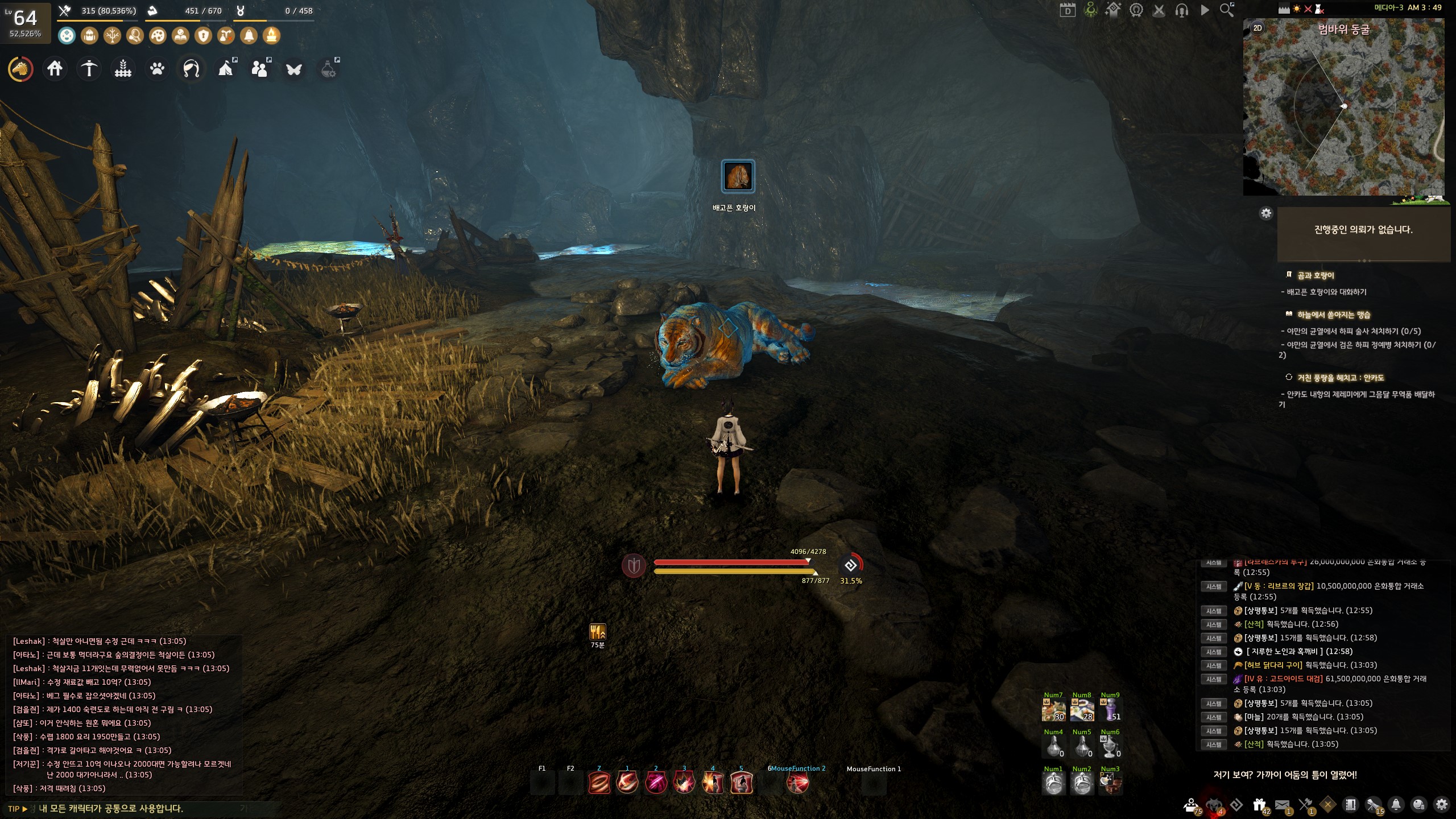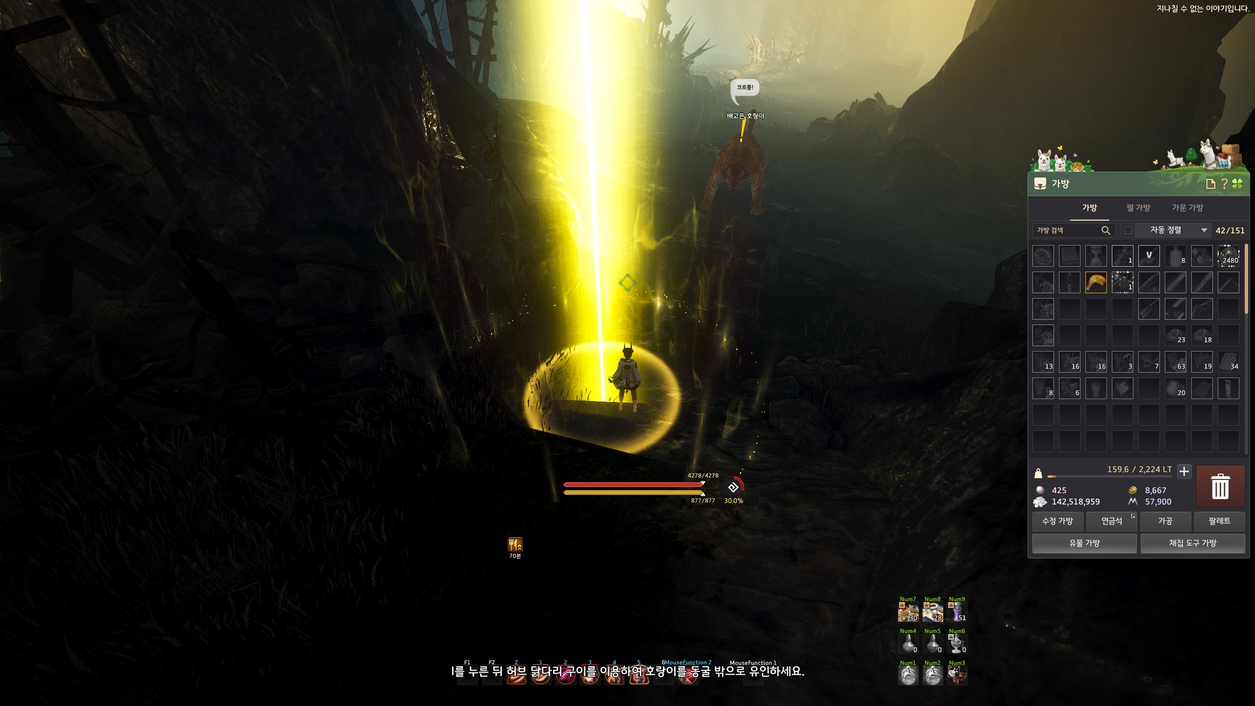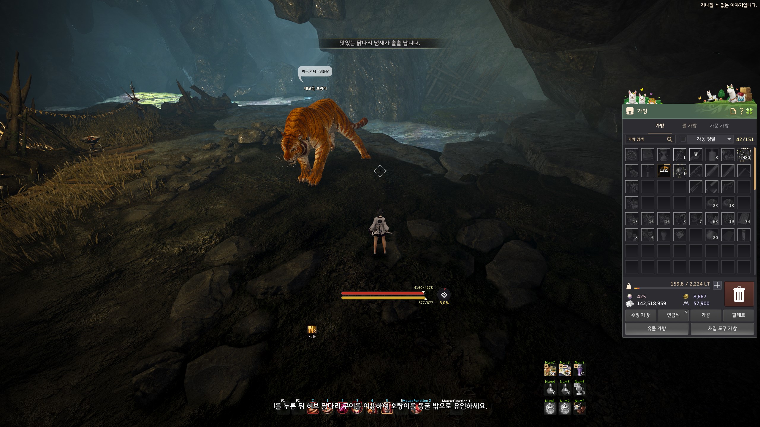 의뢰 보상으로 받은 허브 닭다리 구이를 클릭하면서 호랑이를 유혹해 노란빛기둥이 빛나는 동굴 입구로 데려와야 합니다.