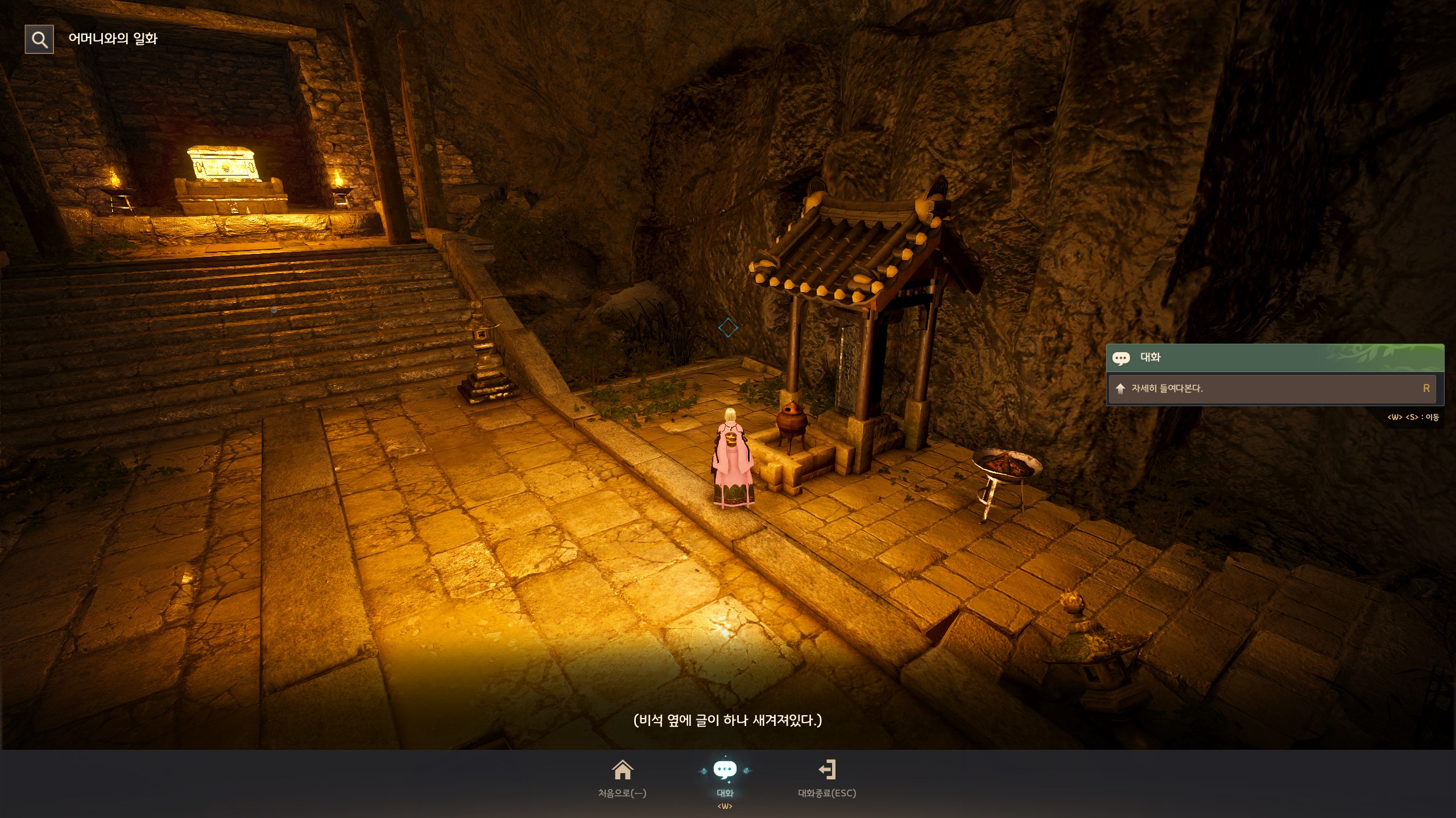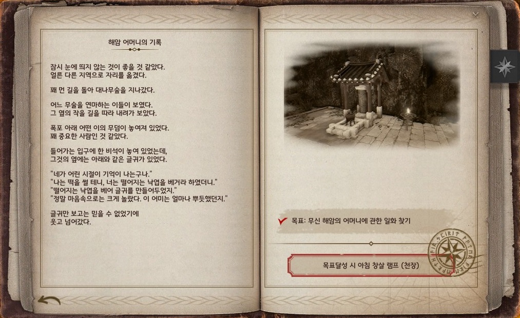 → 한짓골 대폭포 아래에 있는 무신 해암의 무덤에서 오른쪽에 있는 향로 앞에 상호작용 포인트가 있어요.