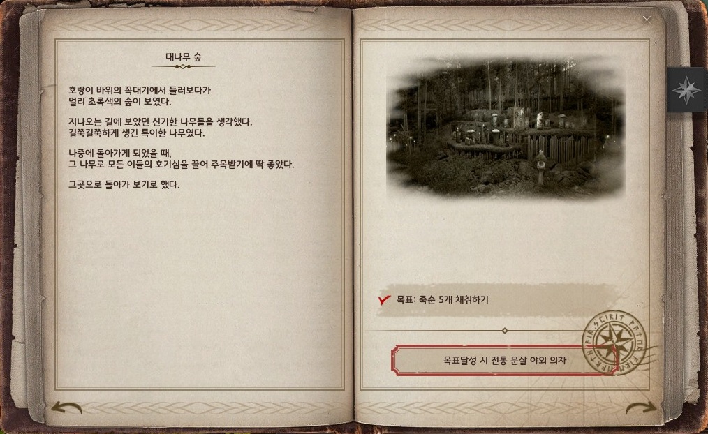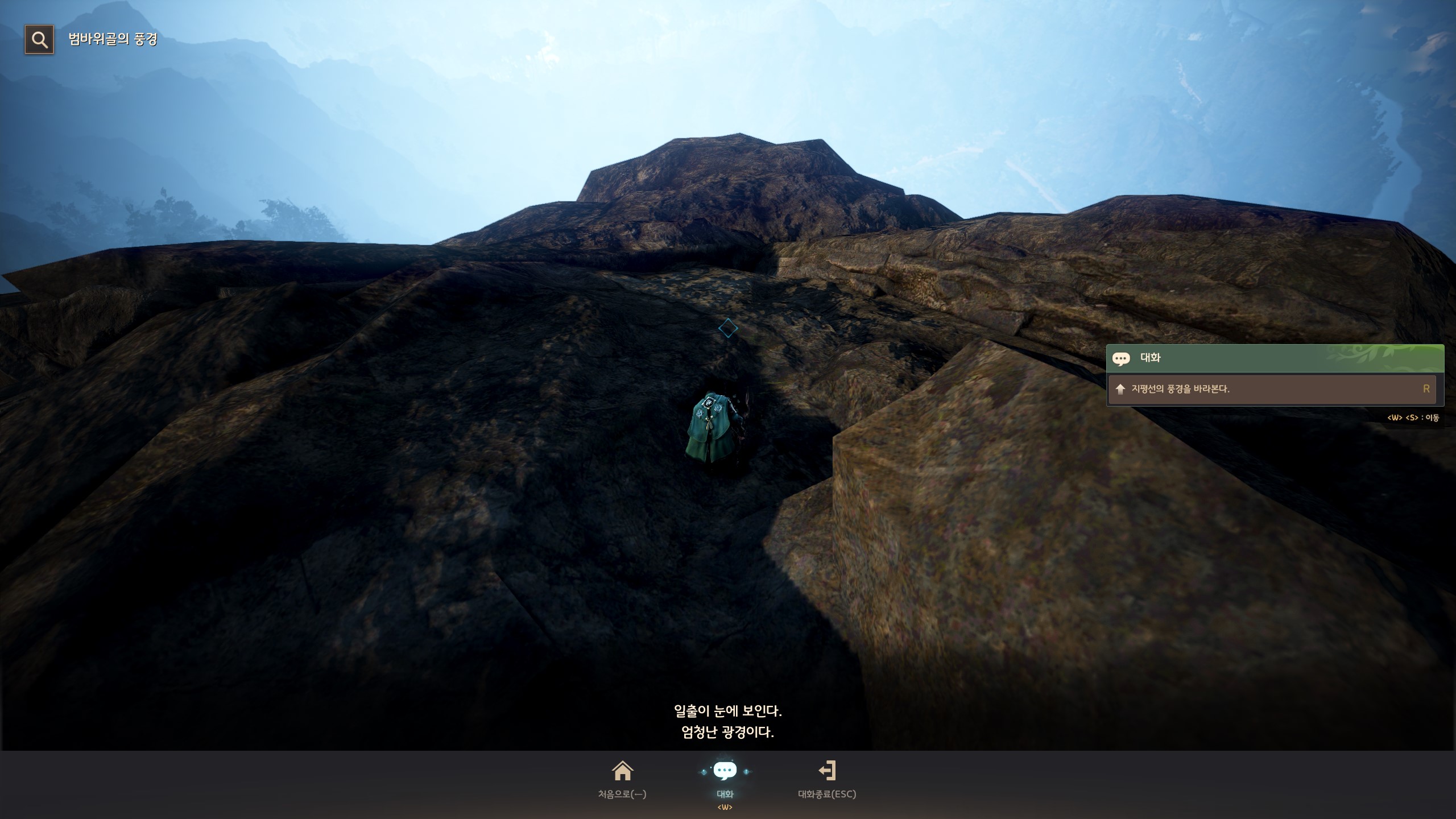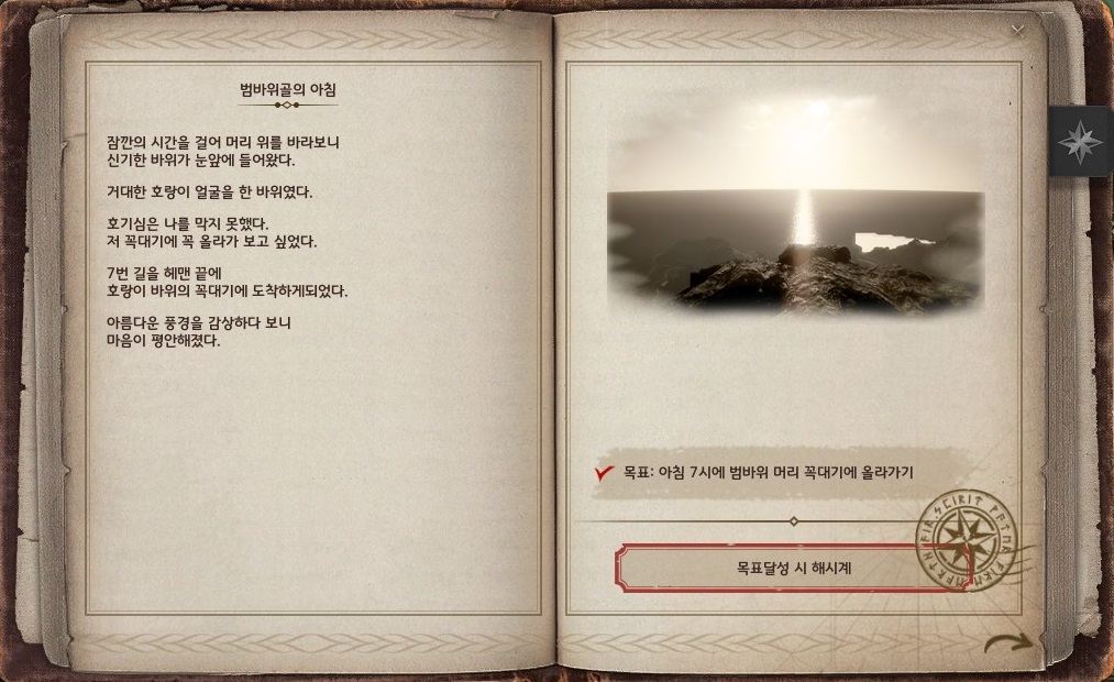 → 호궁의 윗길로 올라가서 범바위의 미간에 상호작용 포인트가 있어요. 인게임 시간으로 AM 07:00 ~ AM 07:25 사이에 상호작용 될 거라고 봅니다. 제가 AM 07:28에 갔을 때는 상호작용이 없었던 거로 기억해요.