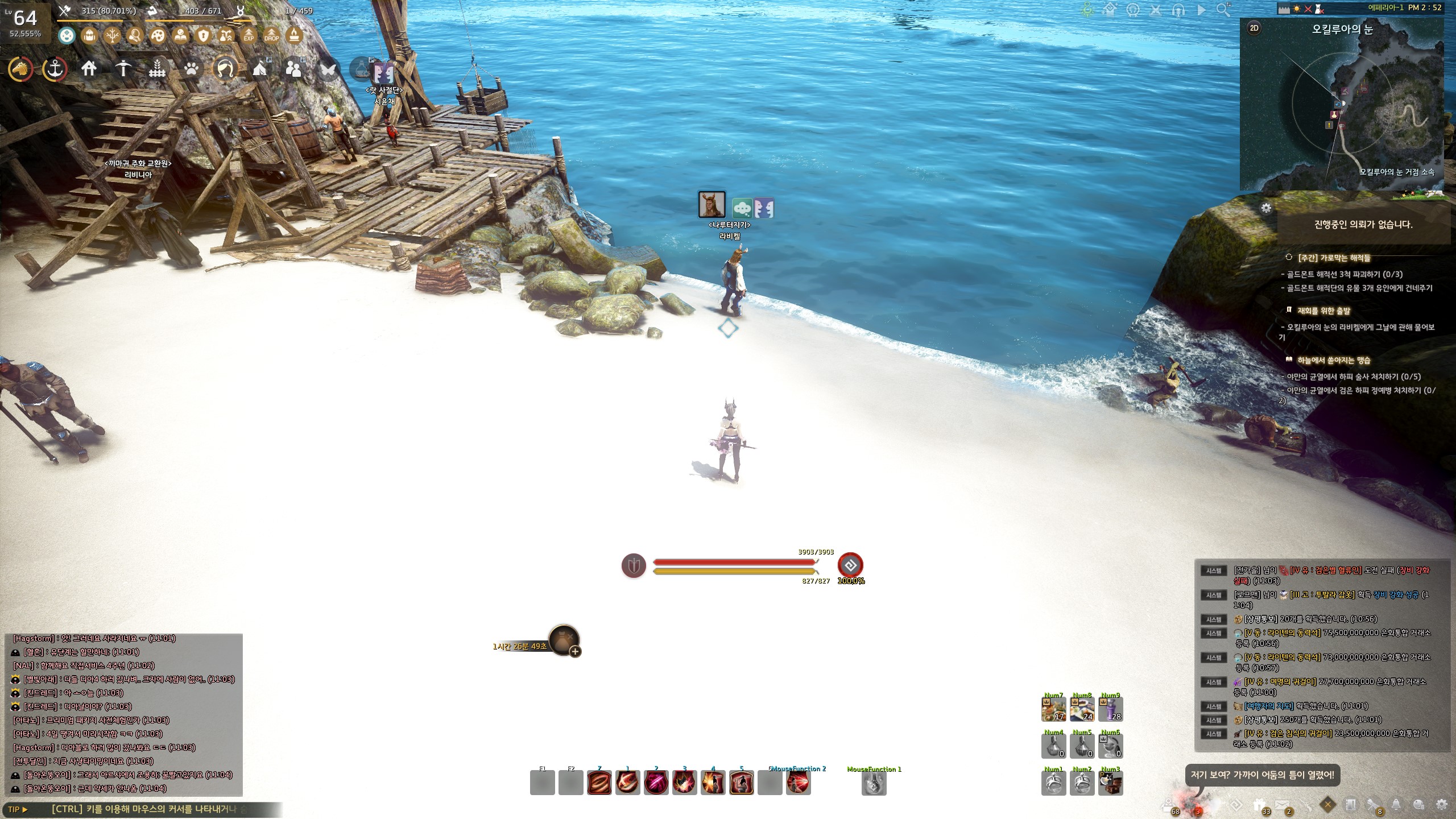 이번 의뢰는 동선이 상당히 긴 편입니다. 높새 포작터 → 오킬루아의 눈 → 벨리아 → 올비아 → 높새 포작터로 이어지는 동선이기 때문에 선박을 이용하거나 정기선을 이용해야 합니다.