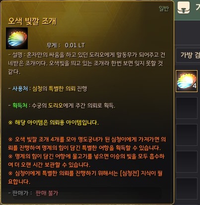 - 의뢰 수주 조건 : 오색 빛깔 조개 4개 보유, 심청전 의뢰를 완료하여 '심청전' 지식 보유
