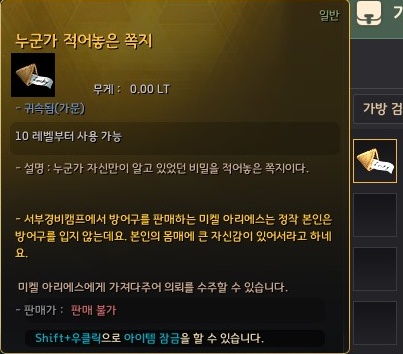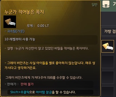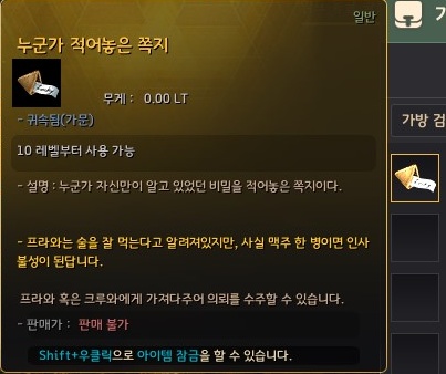 그리고 허름한 상자와 상호작용하여 얻은 쪽지는 중복하여 다시 얻을 수 없었어요. 하지만 다른 분이 올린 글을 보면 이미 지급받은 쪽지를 버렸을 때 하루정도 지난 뒤에 가면 다시 얻을 수 있었다고 합니다.