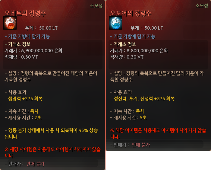 아무리 복용해도 소모되지 않는 회복제, '오네트의 정령수', '오도어의 정령수'를 제작하는 데 필요한 재료 아이템을 획득하실 수 있습니다.