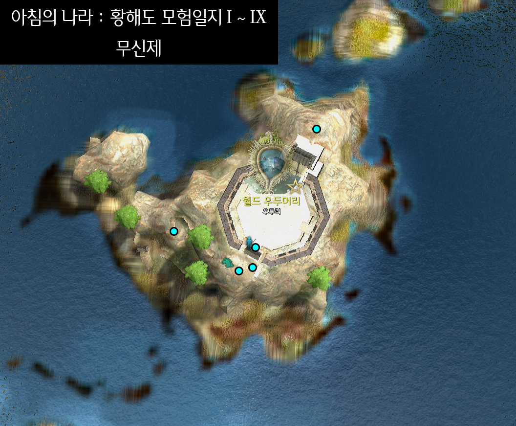 전체 월드맵으로 아침의 나라 : 황해도 모험일지 지식 위치를 대략적으로 표시해 둔 이미지입니다.