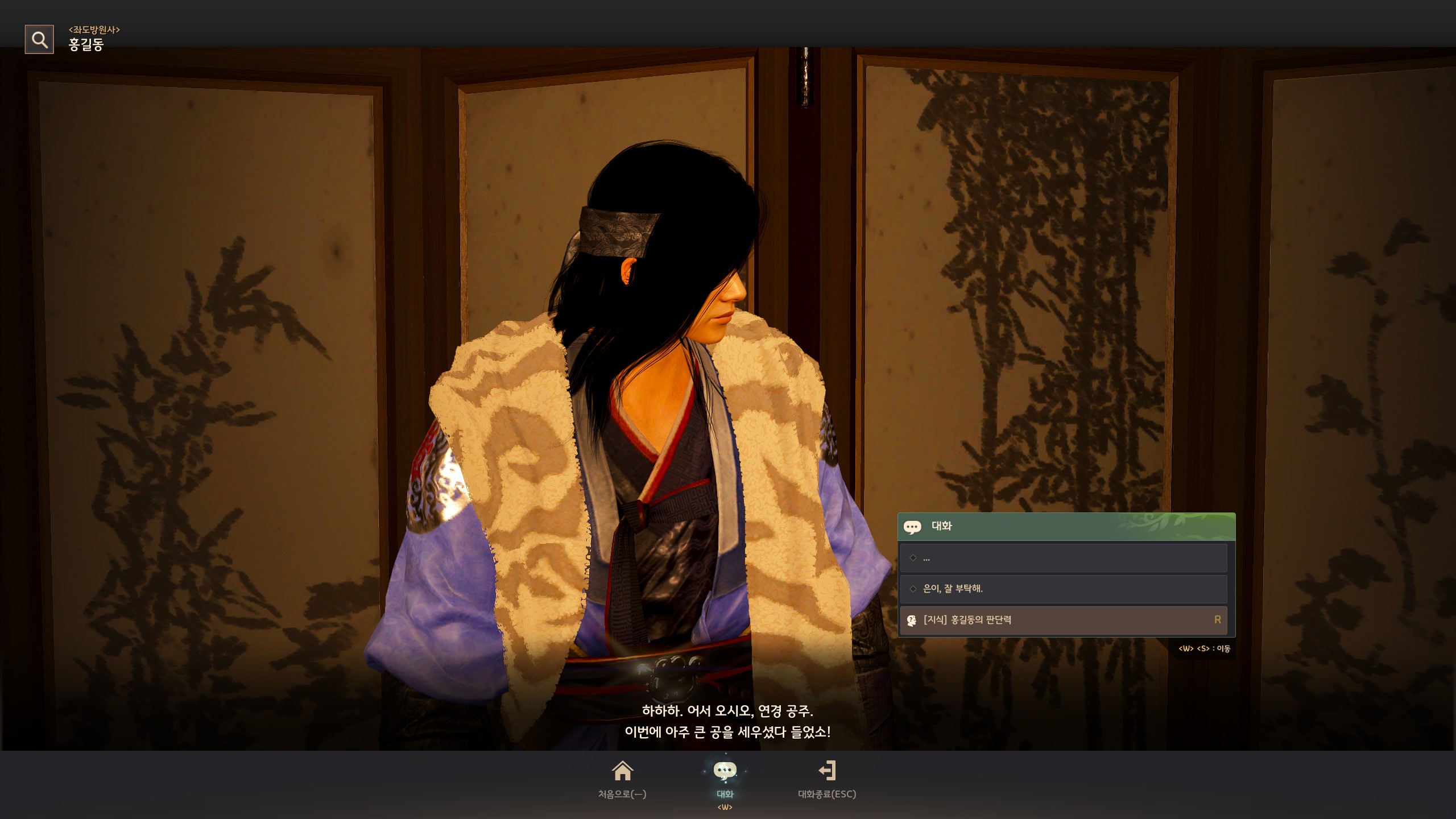 → 아침의 나라 : 서울 메인 의뢰 중 '[나그네전] 조례'를 완료 후, 원진궁에 있는 <좌도방원사> 홍길동과 대화