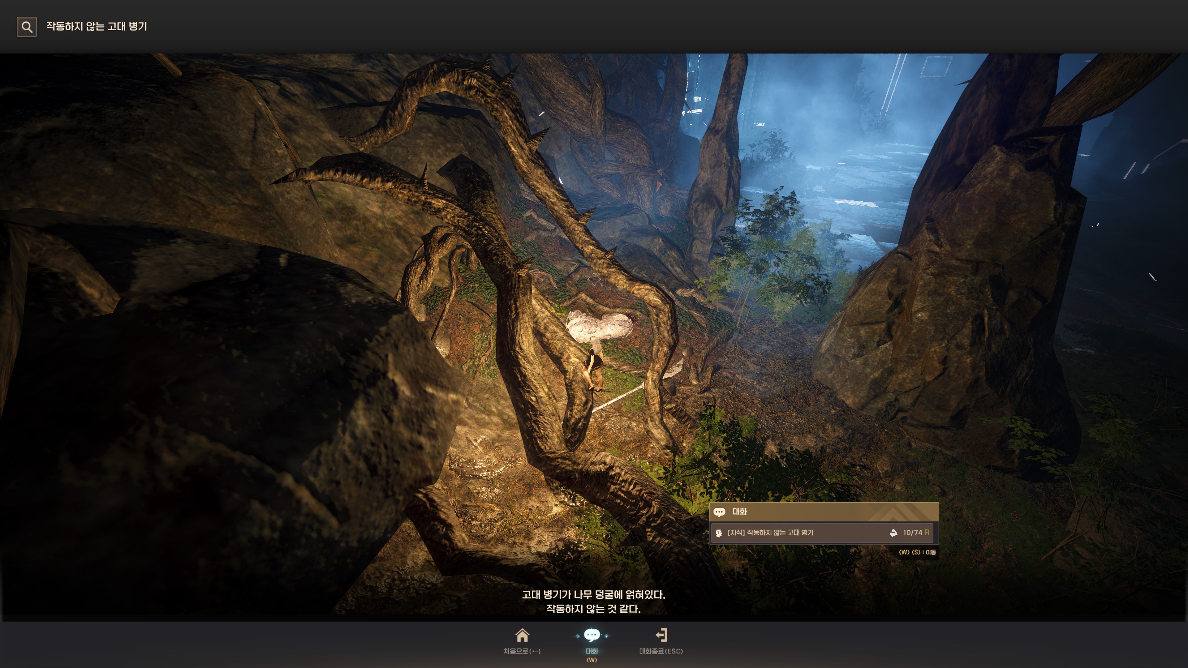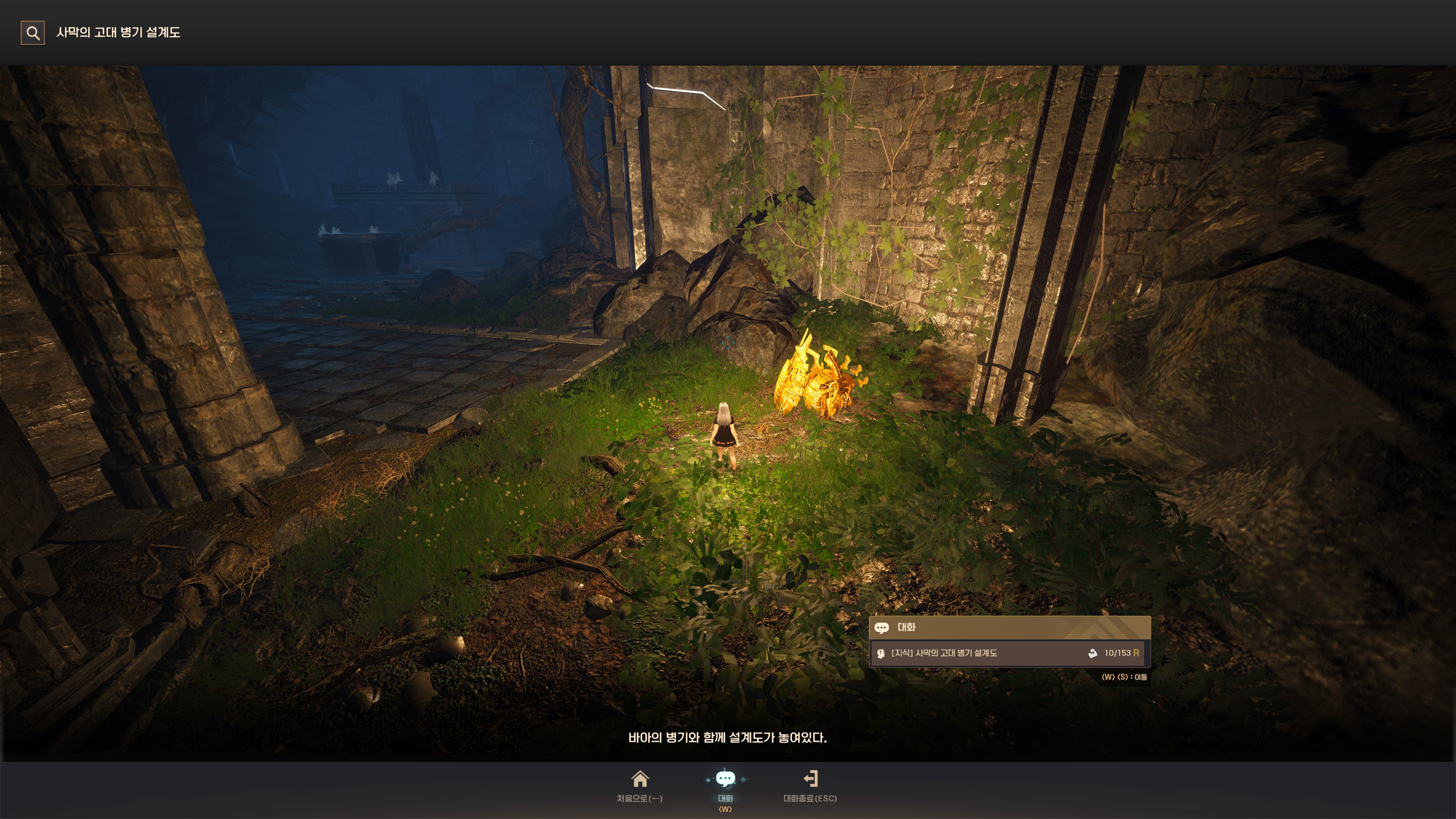 → 오르의 덩굴 1번째 구역 입구에서 바로 오른쪽 뒤로는 '사막의 고대 병기 설계도' 지식이 보여요. 지식 획득 시 기운 10이 소모돼요.