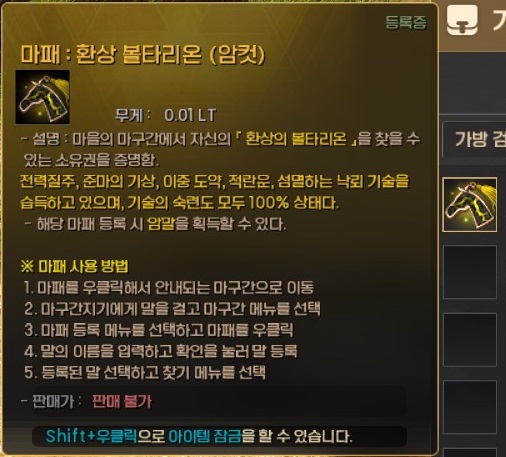 ※ 볼타리온은 마시장에 등록하여 판매할 수 없습니다.