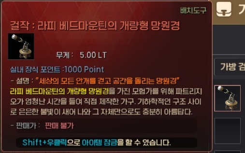 걸작 : 라피 베드마운틴의 개량형 망원경 아이템과 칭호 <천리안>을 획득할 수 있습니다.