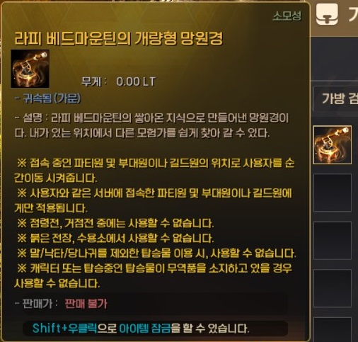 라피 베드마운틴의 망원경은 쿨타임이 10시간이고, 같은 채널에 접속 중인 파티원 or 길드원의 위치로 순간이동 시켜줍니다.