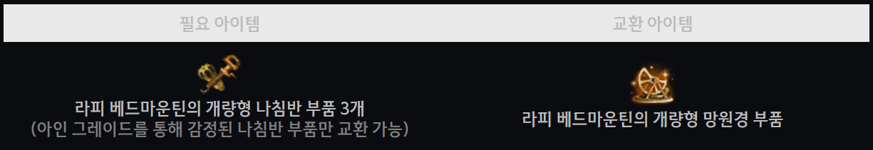 필요한 재료는 라피 베드마운틴의 개량형 망원경 부품 (툰그라드 처단자, 테흐므린 정예병, 절규의 어둠 추종자), 별빛 다이아몬드 1개, 금빛 토파즈 1개예요.