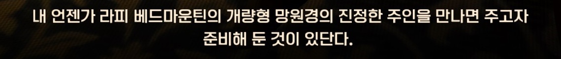 라피 베드마운틴의 망원경은 울루키타 지역의 툰그라드 유적지, 죽은 자들의 도시, 어둠 추종자 침소에서 총 3종류의 라피 베드마운틴의 개량형 망원경 부품을 얻으셔야 해요.