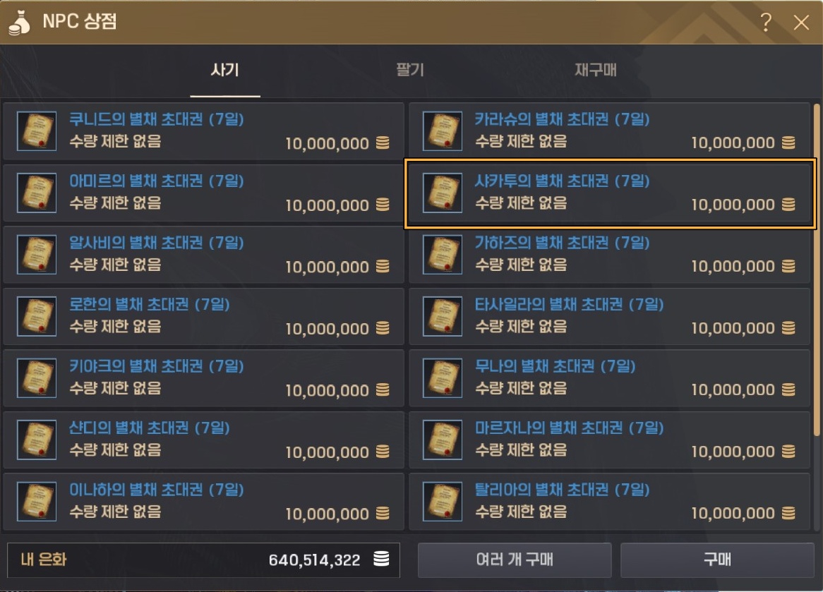 → 의뢰 내용으로는 금괴 100G가 필요하다고 하지만 별채 초대권을 은화로도 구매할 수 있게 변경되어 금괴를 준비할 필요는 없습니다.