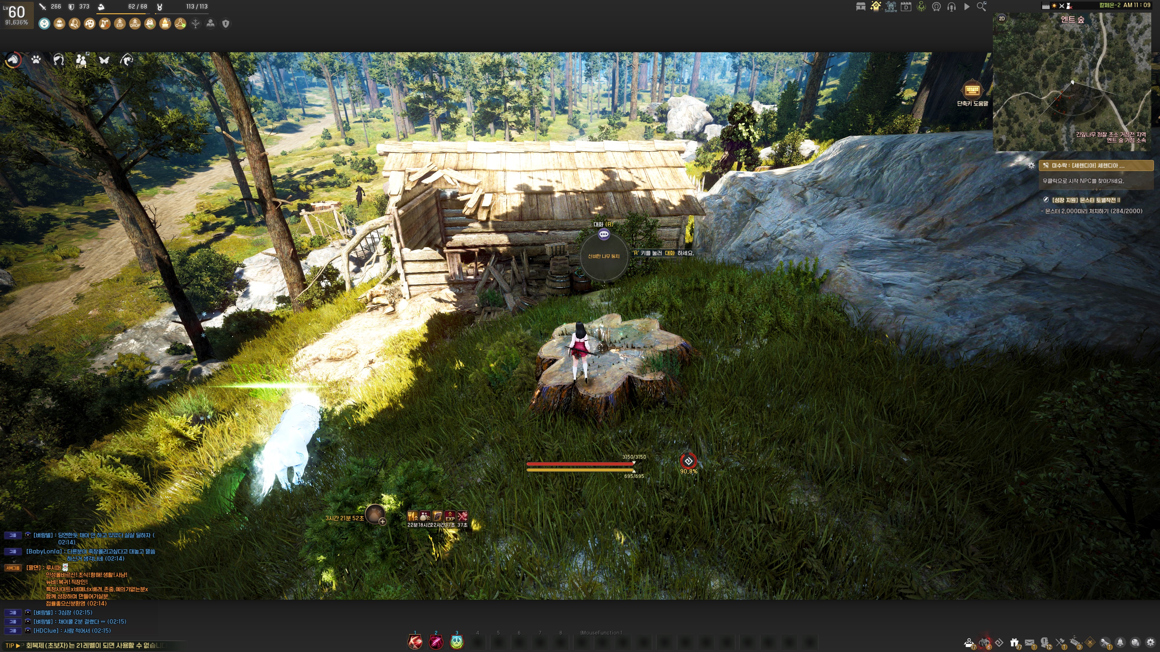 → 엔트 숲 거점 5시 방향의 다리 건너고 있는 오두막 집 옆의 그루터기와 상호작용 하기