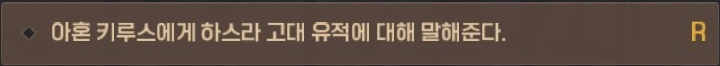 → 하스라 절벽에 있는 하스라 고대 유적의 몬스터 5마리 처치하기. 입구를 찾기 어렵다면 월드맵에서 사냥터 이미지를 우클릭하면 위치를 안내해 줍니다.