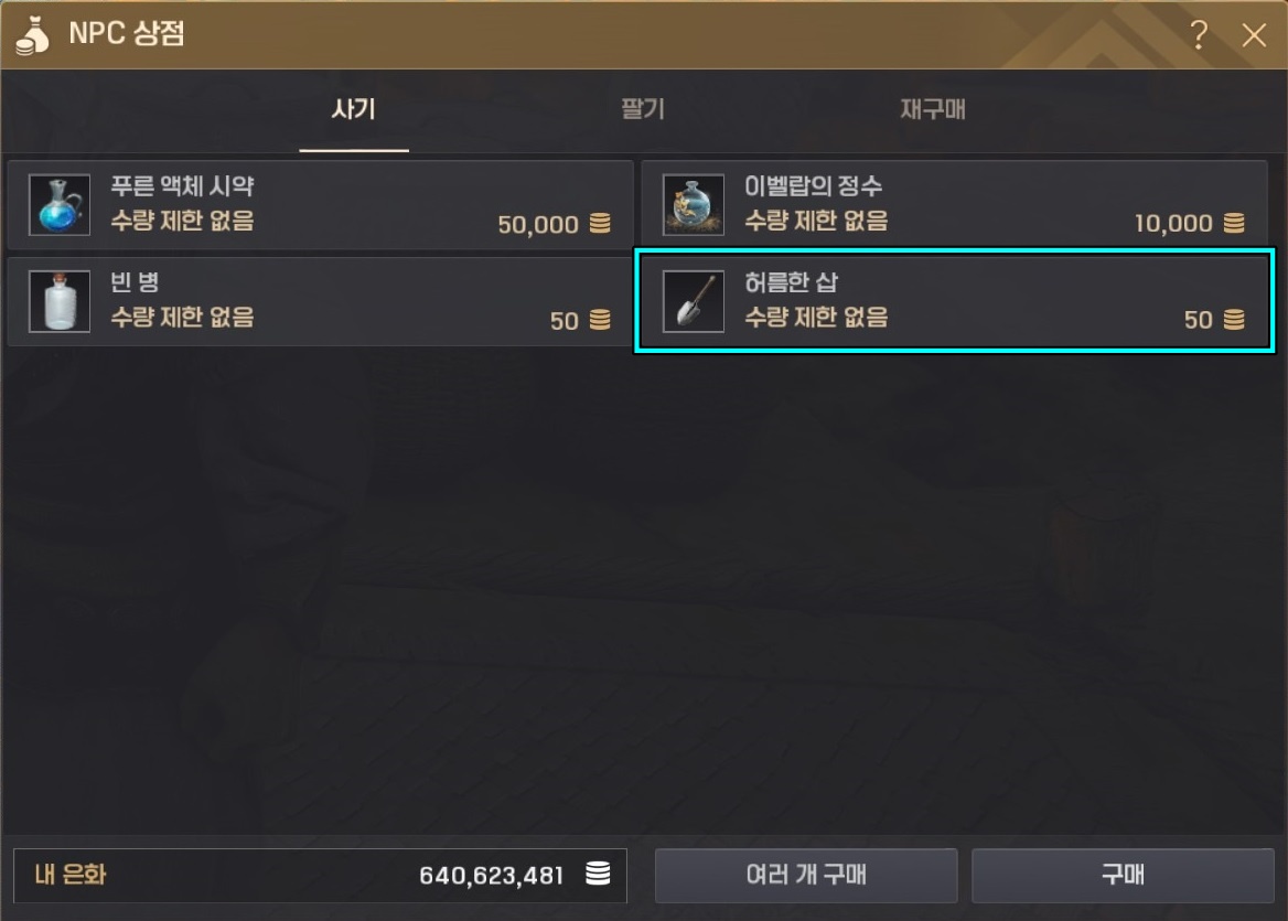 혹은 발렌시아 지역 <재료상인> NPC에게 '허름한 삽'을 구매한 뒤, 사막 지역에서 허름한 삽으로 채집하여 얻은 뒤 사용하셔도 됩니다.