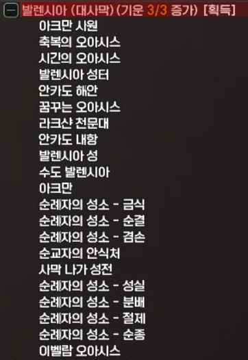 꿈꾸는 오아시스, 시간의 오아시스, 축복의 오아시스, 아크만 사원은 특정 NPC들과 대화로 기운을 소모하여 획득할 수 있습니다.