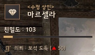 벨리아의 <수정 상인> 마르셀라를 찾아가요. 마르셀라는 <가구상인> 씰루스 옆에 있어요.